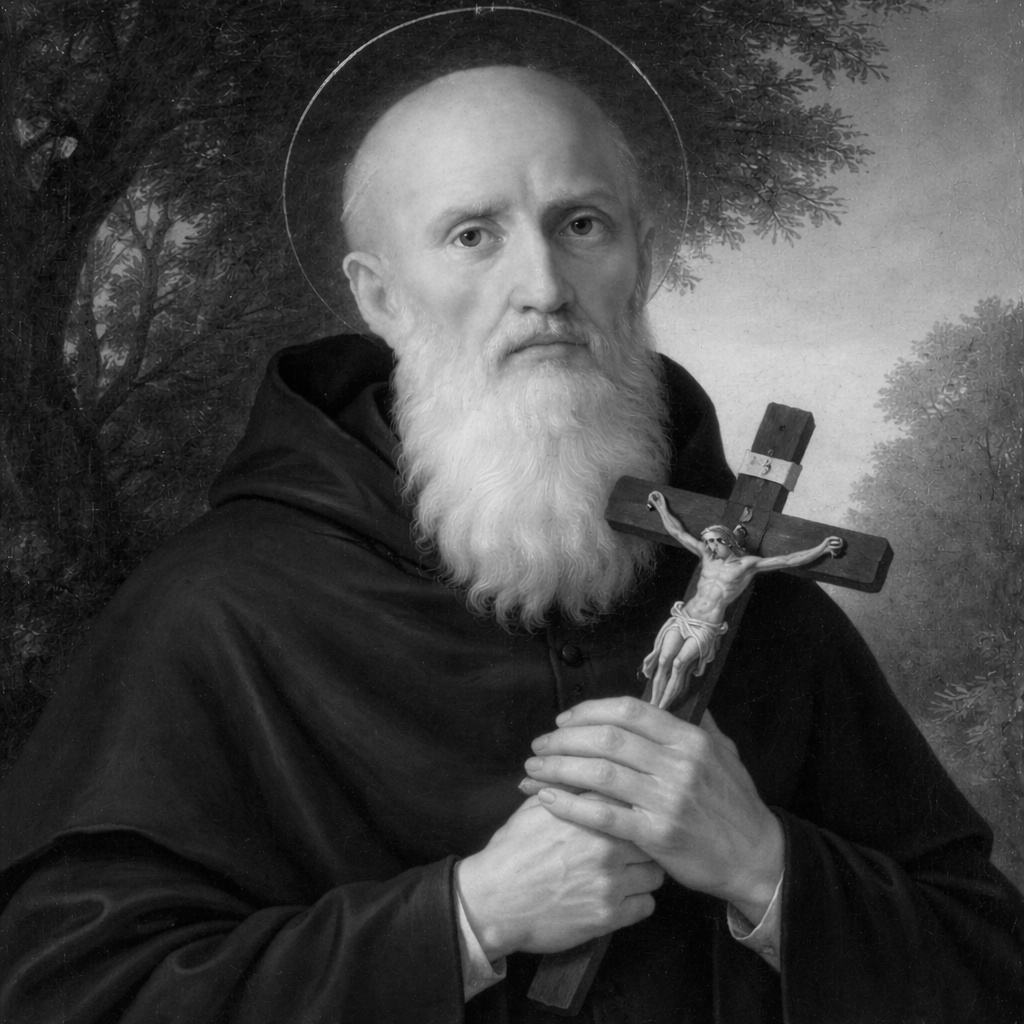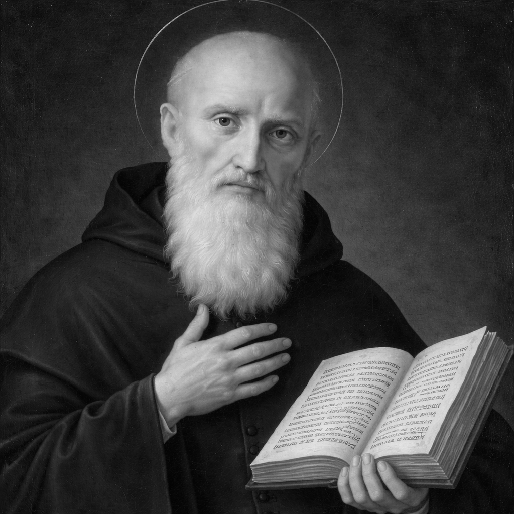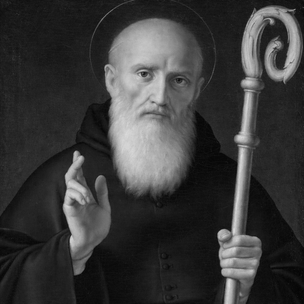 St. Benedict of Nursia (c. 480–547) was an Italian Christian monk and the founder of Western monasticism. Born in Nursia (modern Norcia, Italy), he left his studies in Rome to pursue a life dedicated to prayer, solitude, and spiritual discipline. Seeking holiness away from the corruption of city life, Benedict lived as a hermit before attracting followers inspired by his devotion.